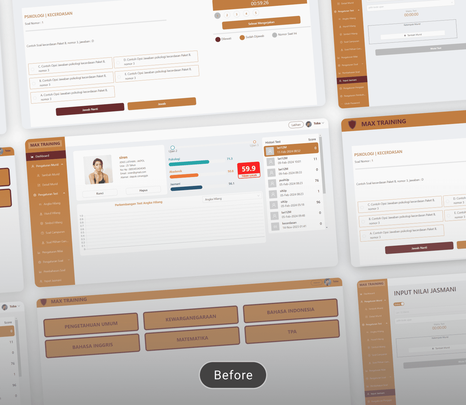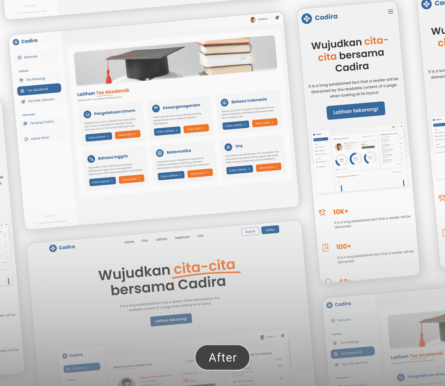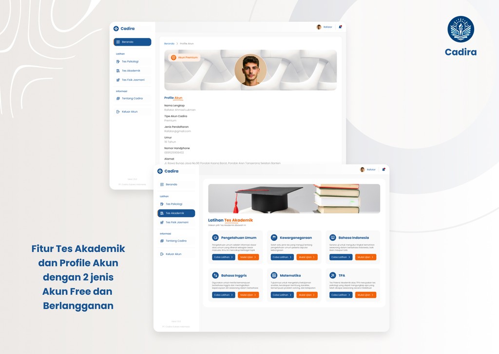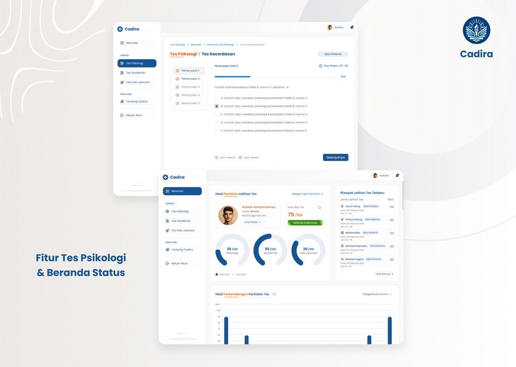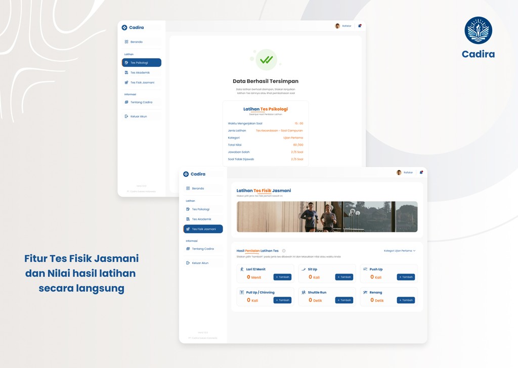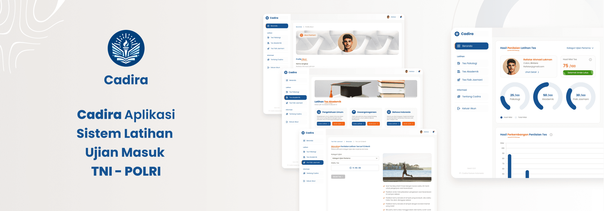 “Cadira” adalah sebuah Aplikasi berbasis website Responsive dengan tampilan sysuser dan leanding page yang digunakan untuk latihan seleksi masuk TNI - POLRI dengan 3 Fitur yaitu test latihan Fisik Jasmani, test Akademik dan tes Psikologi.