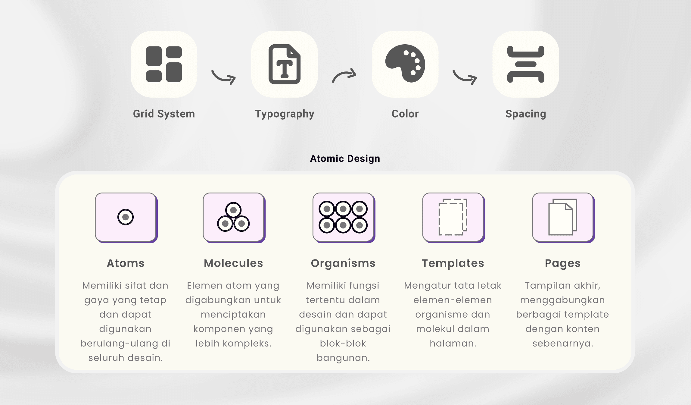 Mengelompokkan komponen berdasarkan fungsi dan tingkat penggunaannya (misalnya: button, form, navigation, card, dsb.) untuk memudahkan standarisasi.Pembuatan Style Guide