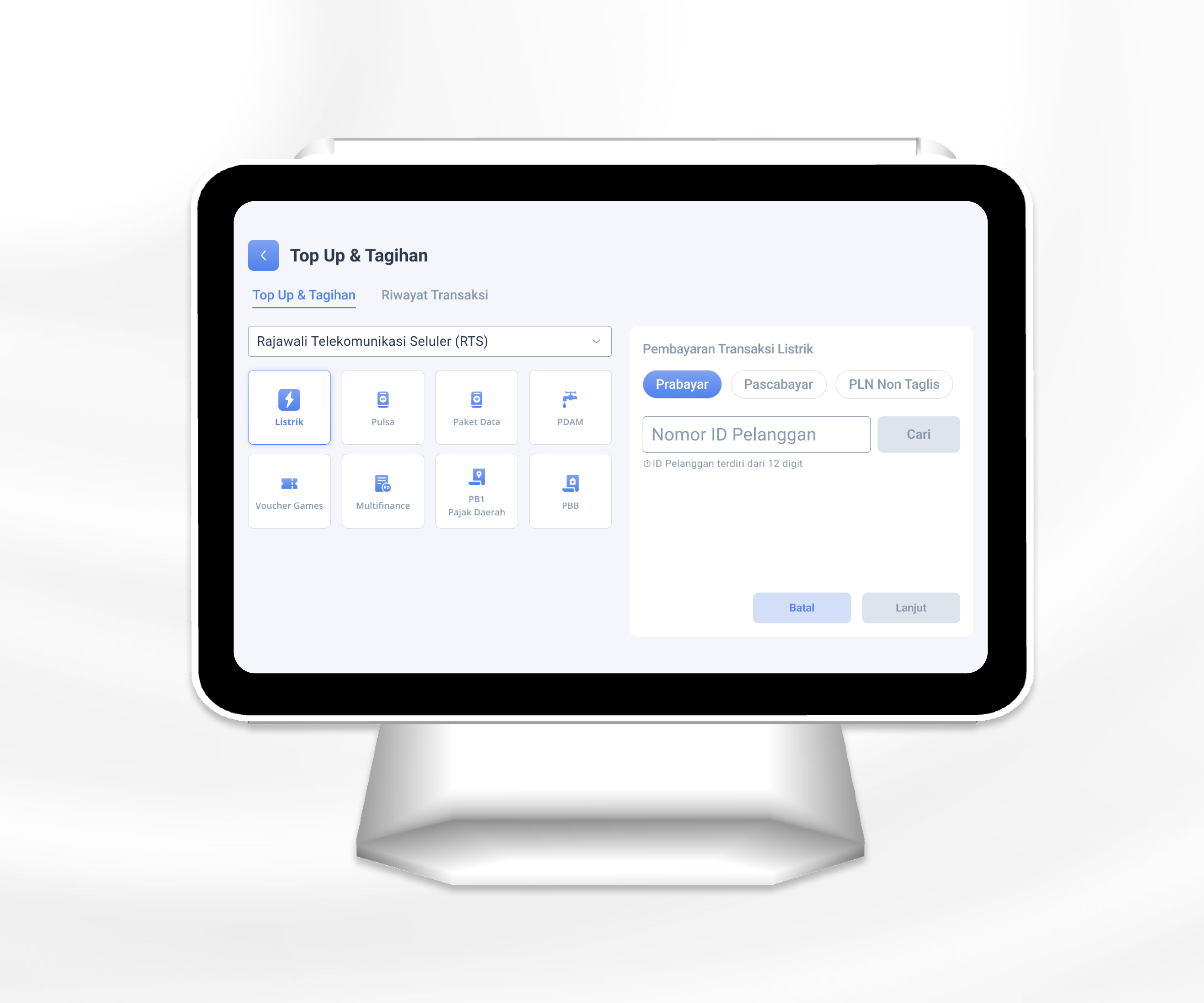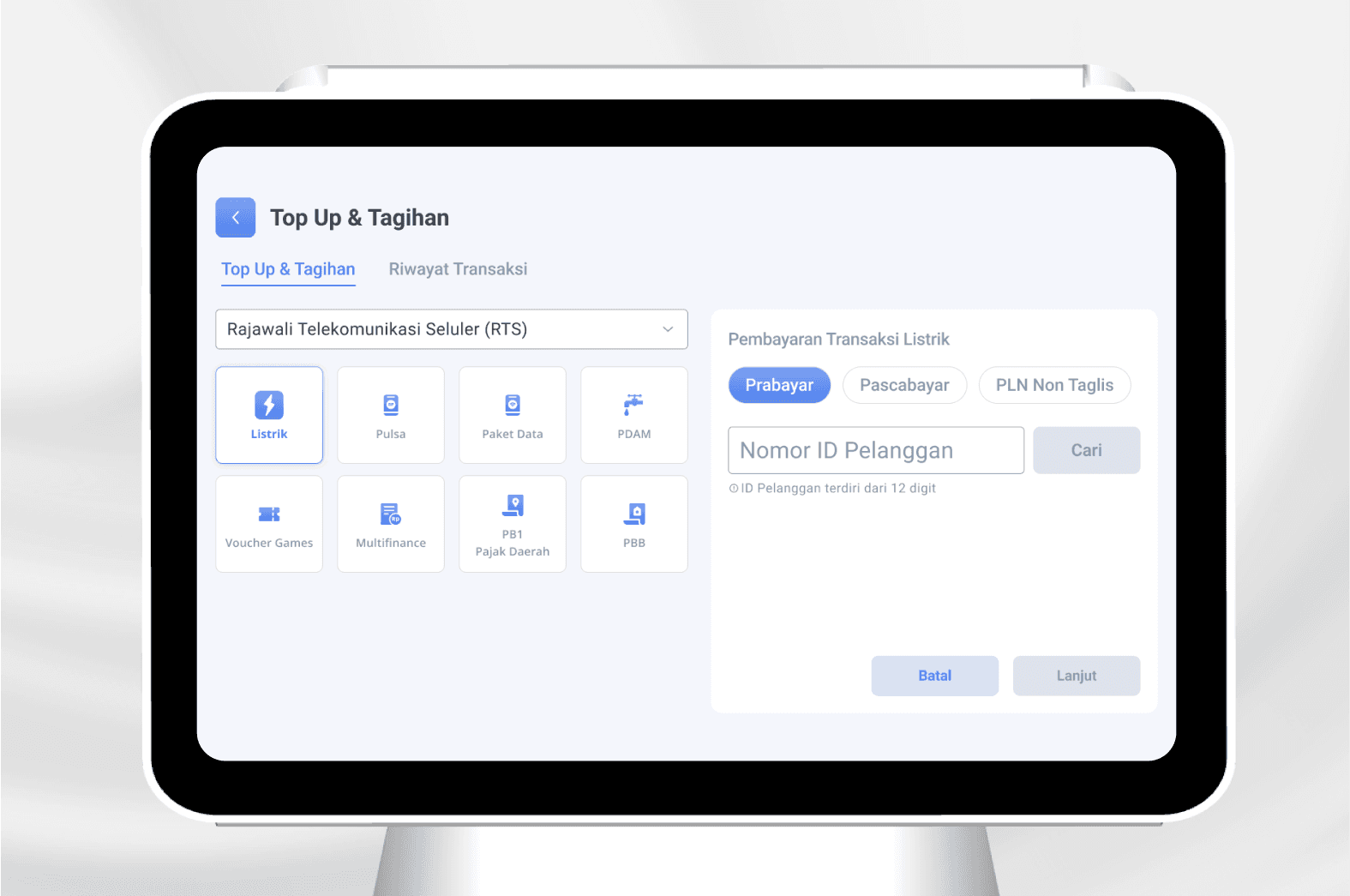 Setelah memilih Top Up & Tagihan, pengguna diarahkan ke halaman khusus berisi kategori layanan dalam bentuk tiles/quick-actions (misalnya: Listrik, Pulsa, Paket Data, PDAM, Voucher Games, Multifinance, Pajak Daerah, PBB).