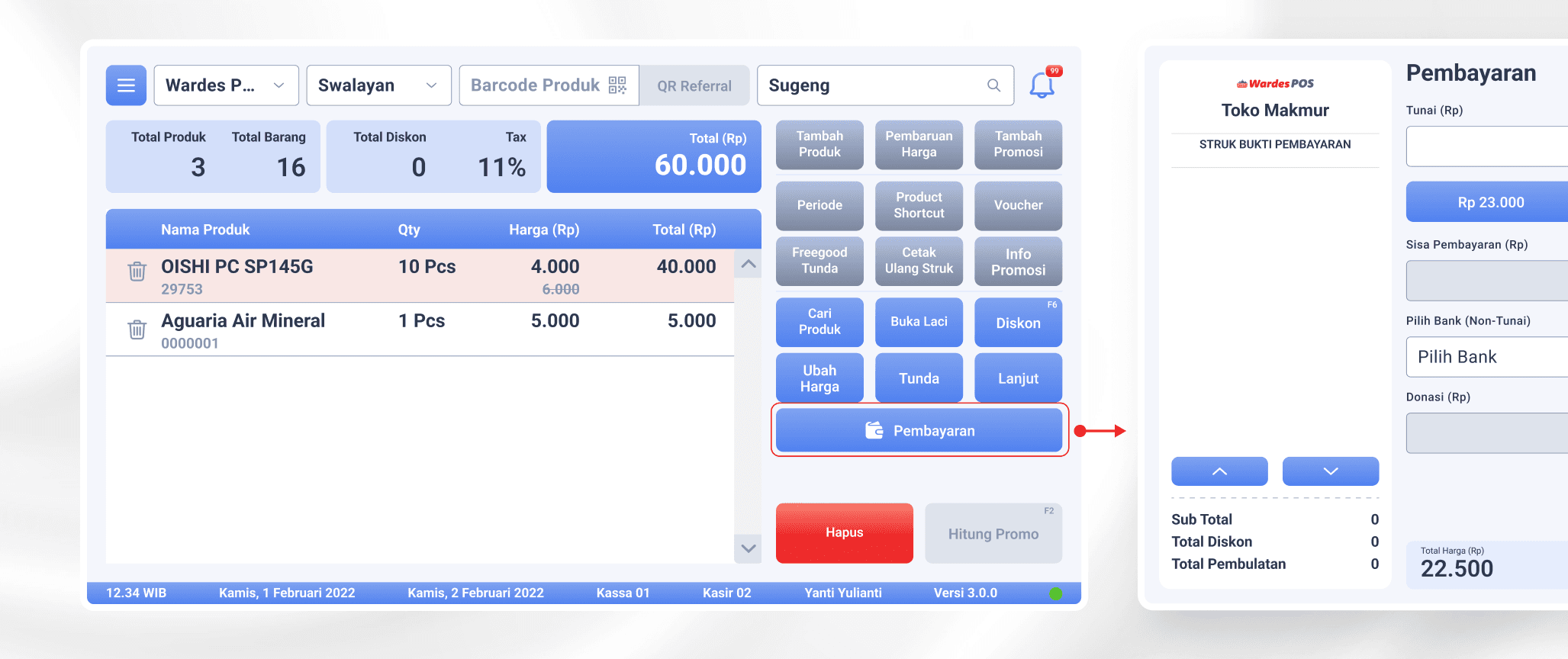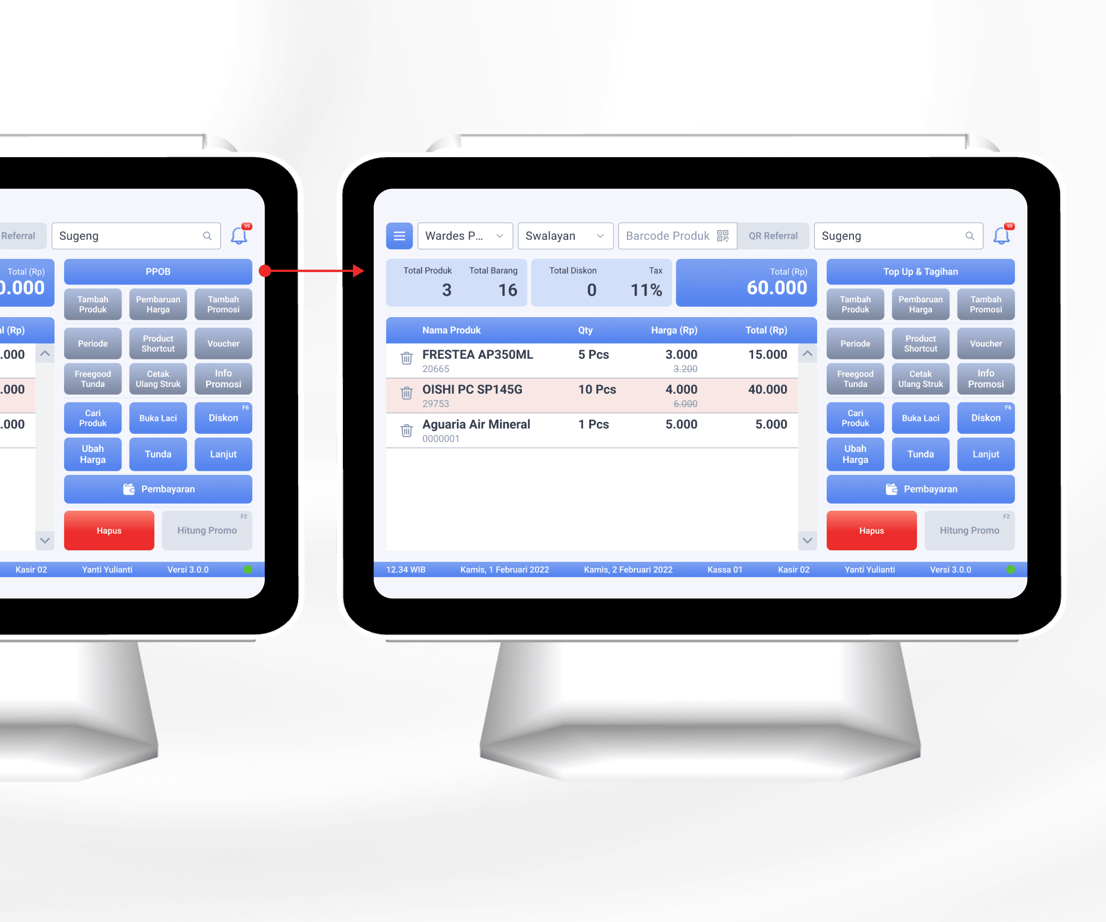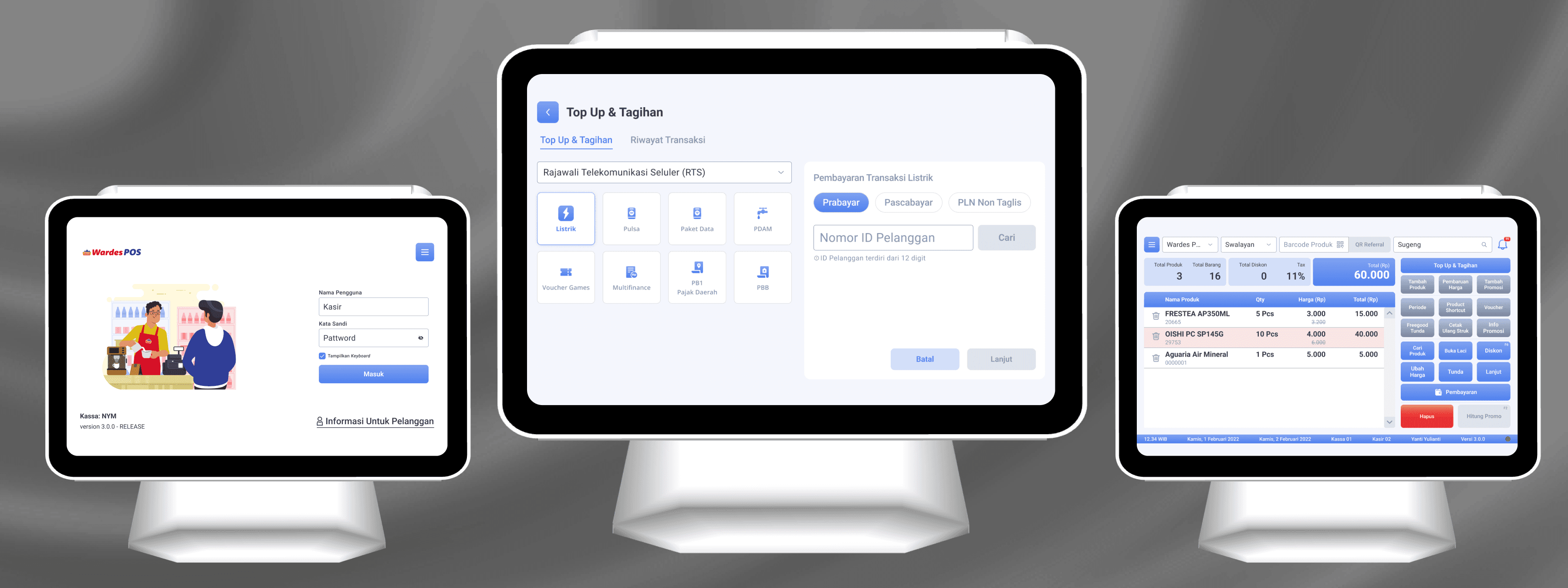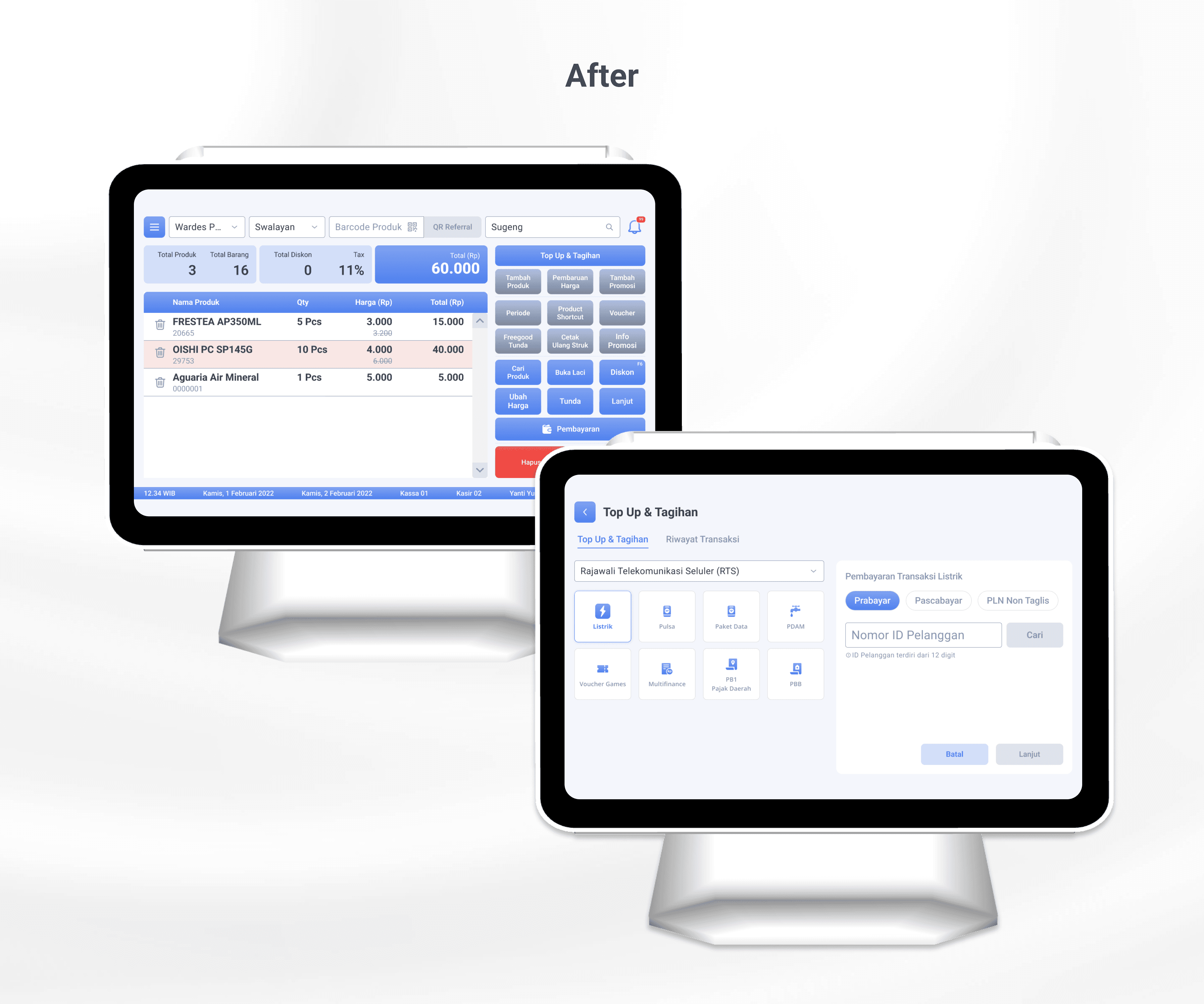 Di sini, PPOB bisa digabung dengan transaksi belanja lain dalam satu pembayaran (tunai, non-tunai, kartu, atau integrasi bank mitra).