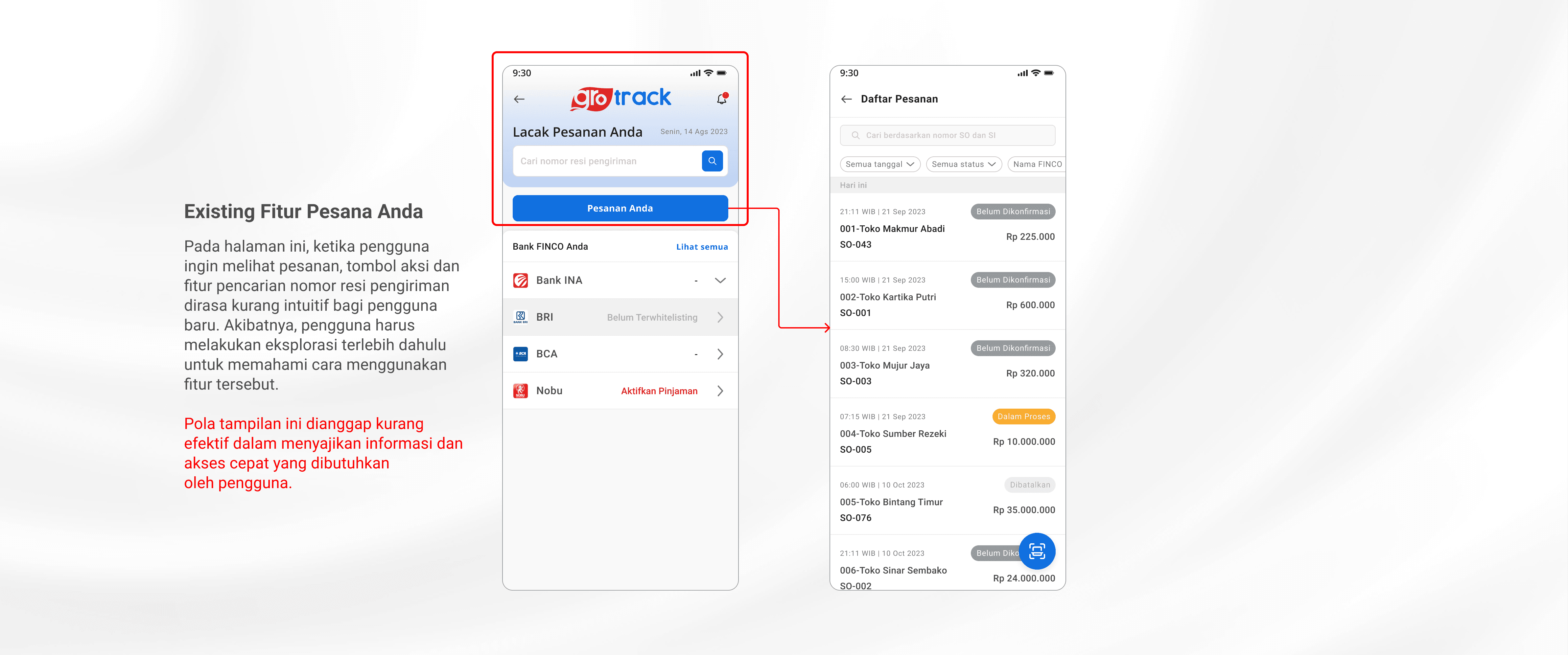 1. Masalah berikutnya Kesulitan dalam menavigasi dan memahami Daftar Bank pengguna dan Pelacakan Status Pesanan Berkelanjutan yang Tidak Efisien. Pola tampilan ini dianggap kurang efektif dalam menyajikan informasi dan akses cepat yang dibutuhkan oleh pengguna.