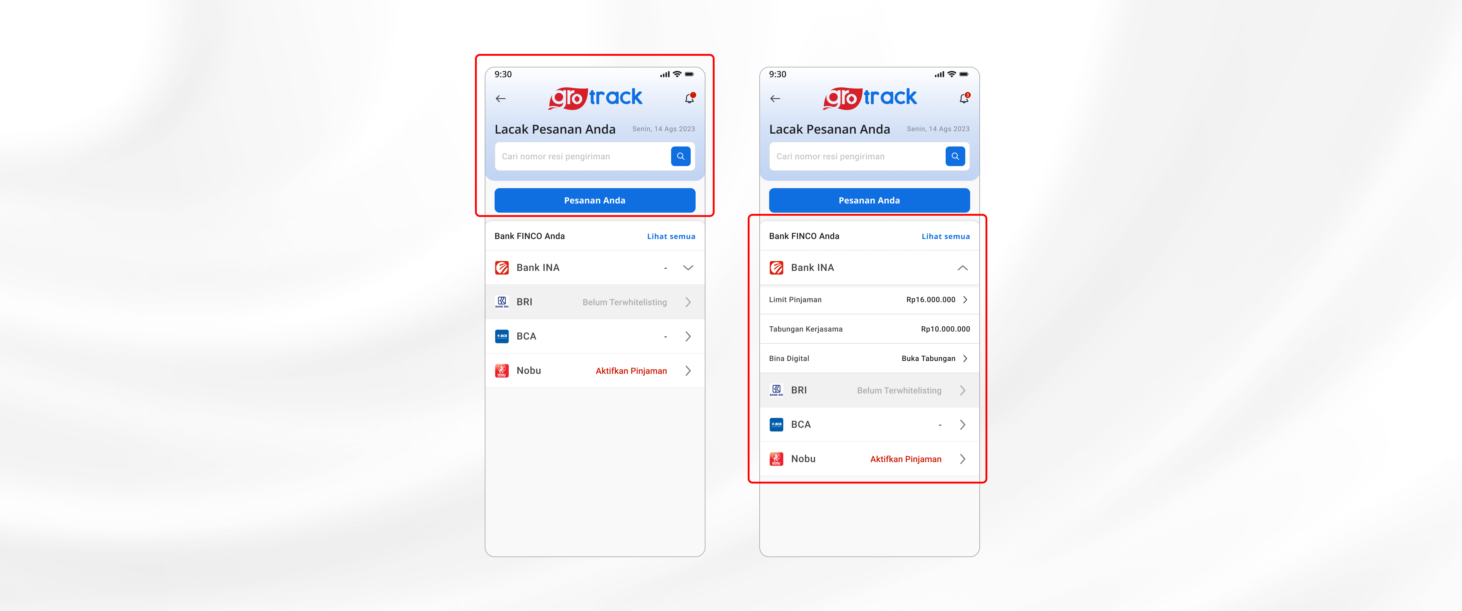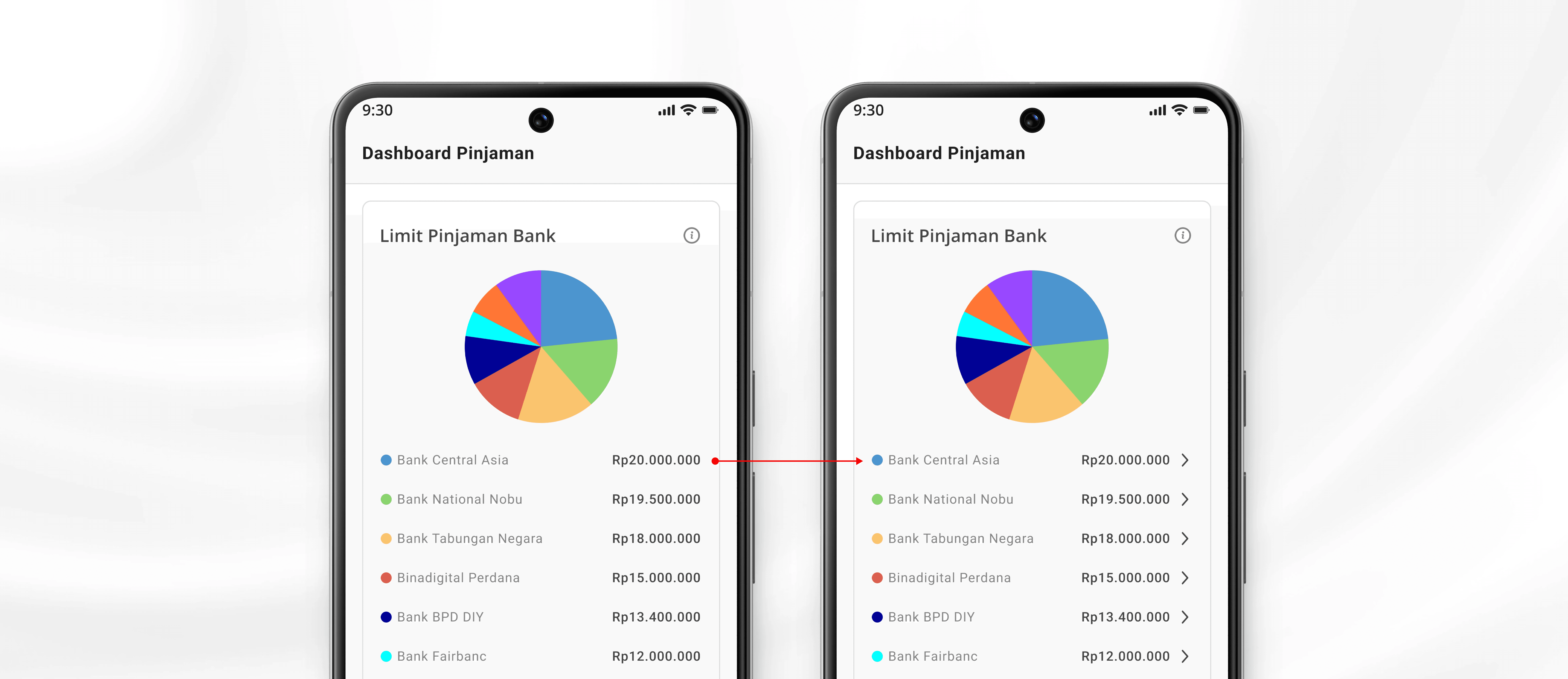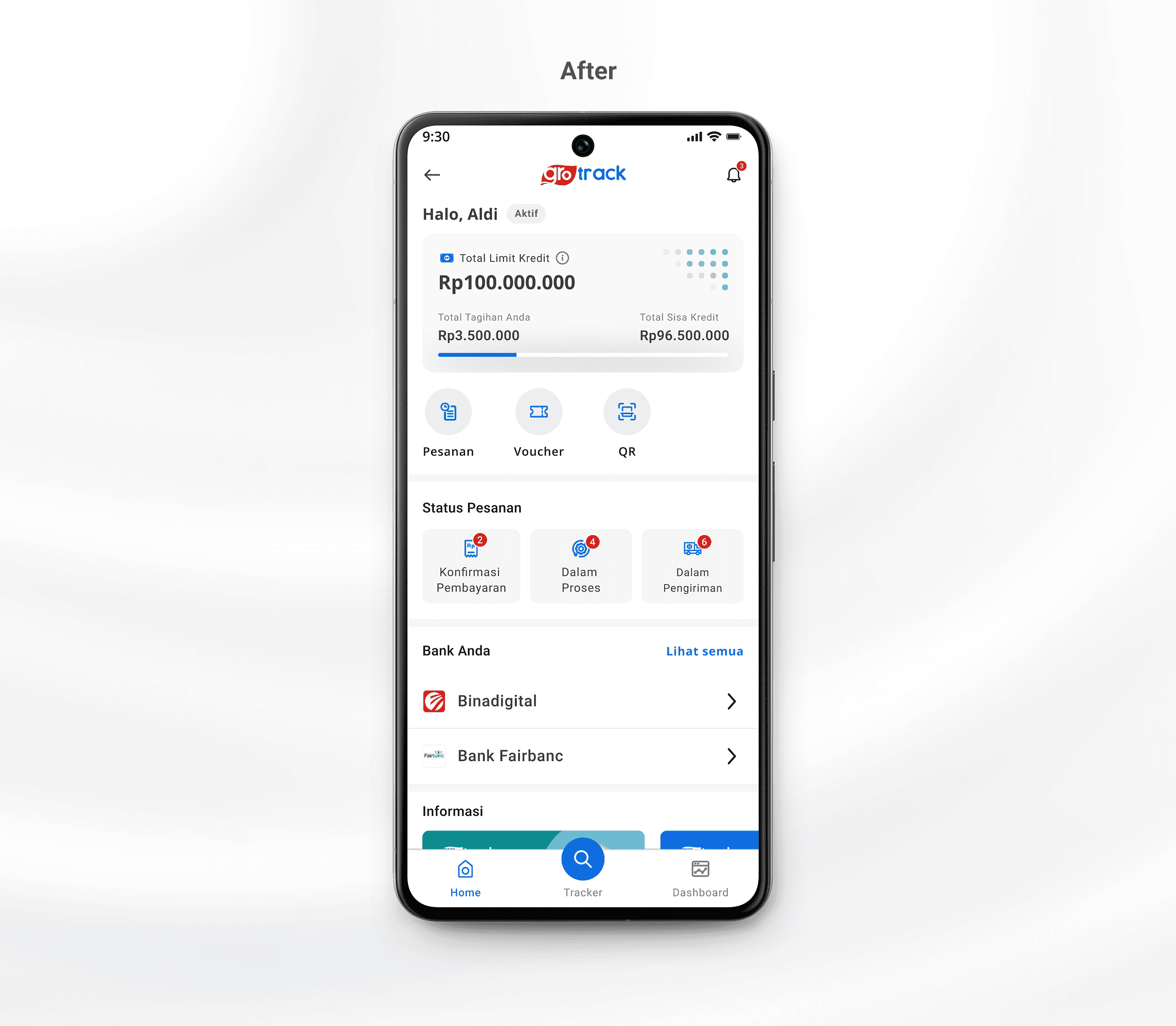 After, beranda didesain ulang dengan dashboard terpusat yang menampilkan kredit, pinjaman, dan status pesanan secara real-time. Navigasi daftar bank menjadi lebih sederhana dengan ikon dan label konsisten, sementara indikator visual seperti warna dan progress bar membantu pengguna memahami batas kredit dengan cepat.