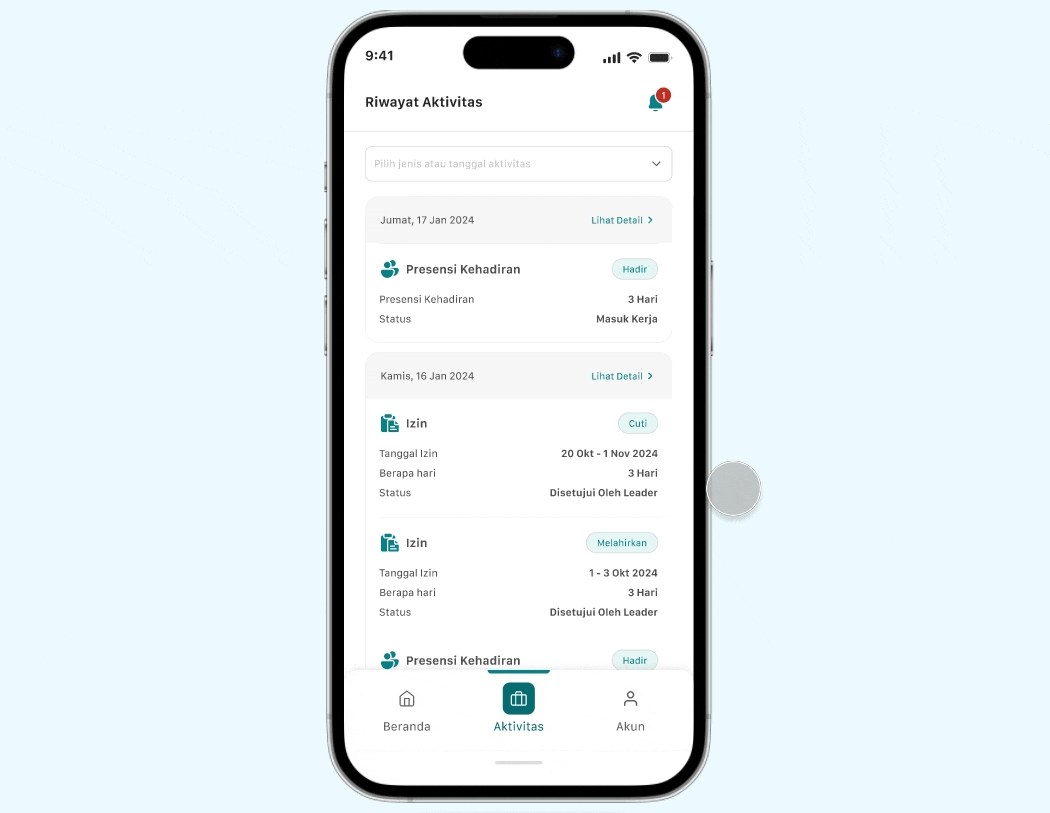 Fitur Riwayat Aktivitas menampilkan rekap harian seperti presensi dan izin, lengkap dengan status dan detail waktu. Pengguna dapat melihat aktivitas per tanggal dan membuka detail untuk informasi lebih spesifik. Halaman Akun memuat data pribadi serta opsi ubah informasi, kata sandi, dan keluar aplikasi. Seluruh tampilan dirancang bersih dan intuitif agar navigasi lebih mudah dan efisien.