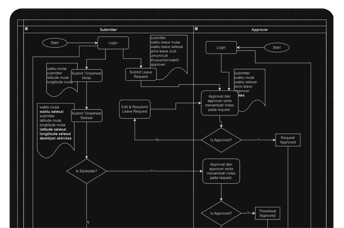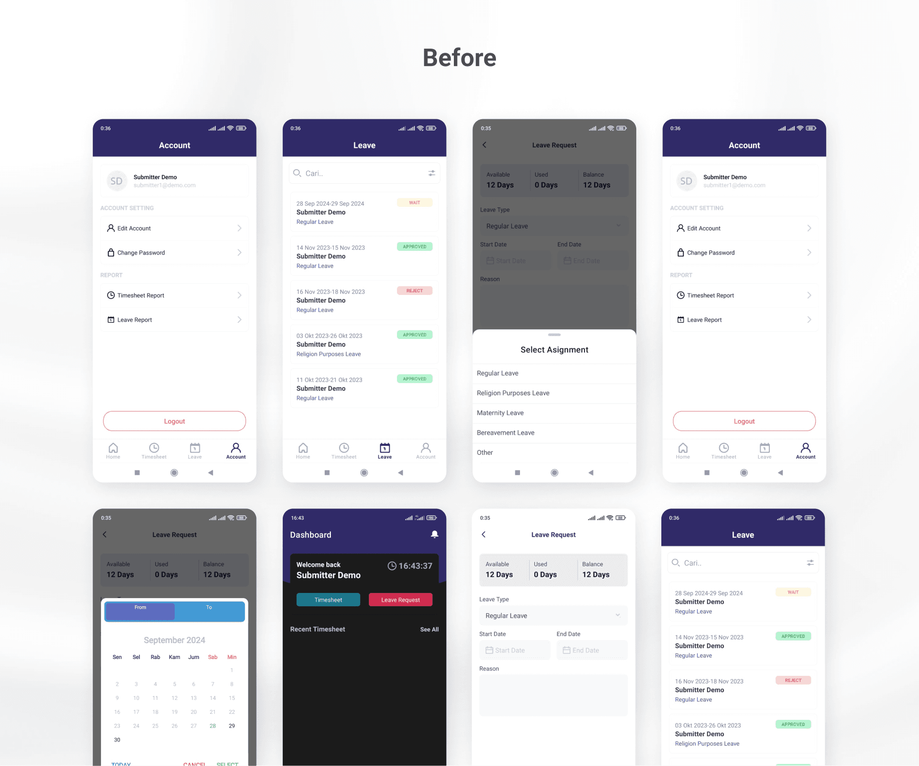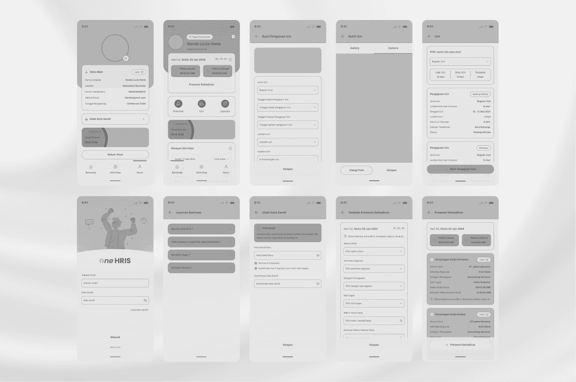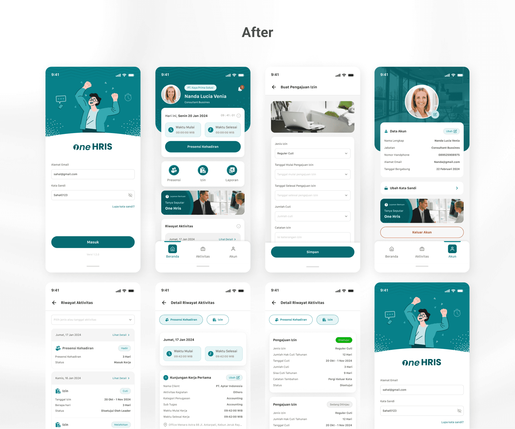 Hasil akhirnya adalah desain aplikasi One HRIS yang intuitif, profesional, dan efisien, mendukung kebutuhan pengguna di berbagai perangkat dan sistem kerja.